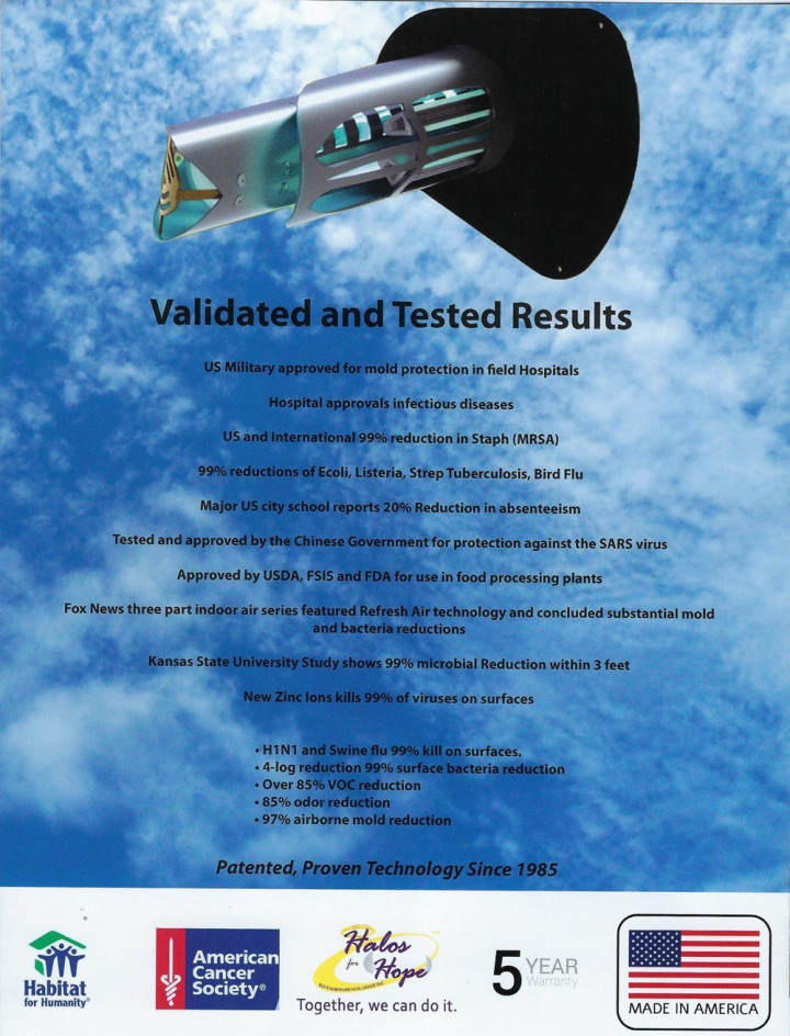 The Refresh Air Purifier is designed to eliminate sick building syndrome risks by neutralizing ordors, particulate, air pollutants, VOCs (chemical odors smoke, mold bacteria and viruses. The Refresh Air Purifier is easily mounted into air conditioning and Heating systems air ducts where most sick building problems start. When the HVAC system is in operation the Refresh system creates and Advanced Oxidation Plasma Consisting of: Ionized Hydro-peroxides, Super oxide ions and Hydroxide ions. All are friendly oxidizers. By friendly oxidizers we mean oxidizers that revert back to oxygen and hydrogen after the oxidation of the pollutant